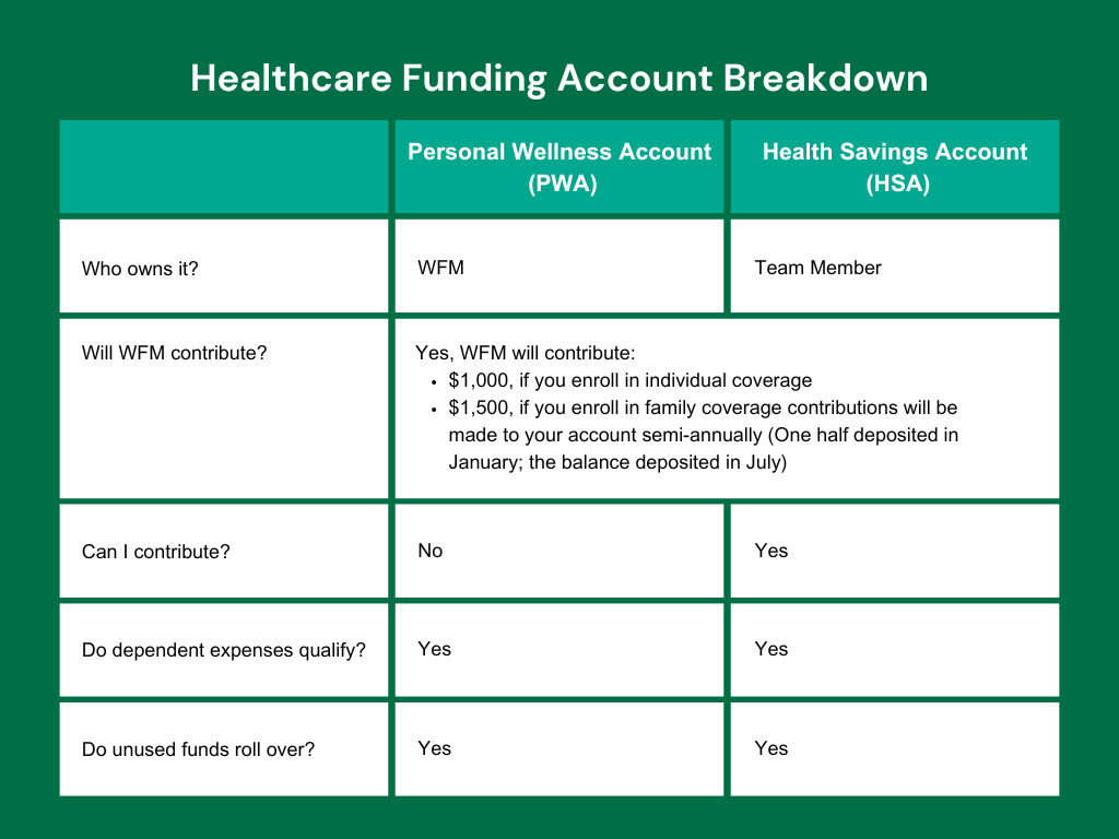 The Whole Health Plan provides Team Members with the options of a Health Savings Account (HSA) or Personal Wellness Account (PWA).